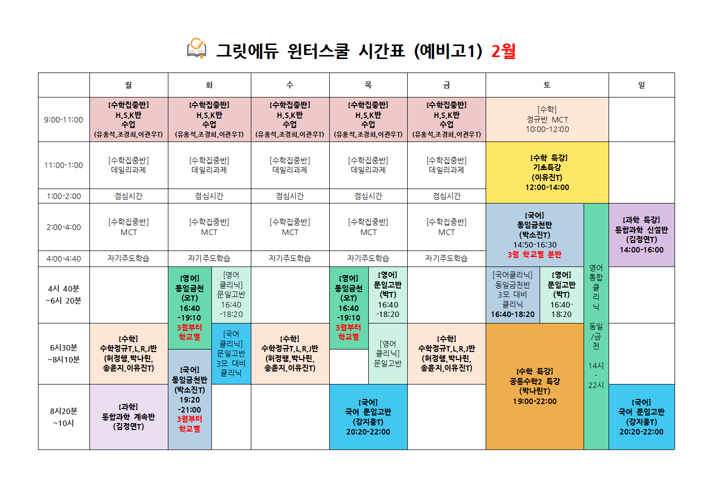 윈터스쿨 기간 수업 시간표입니다.