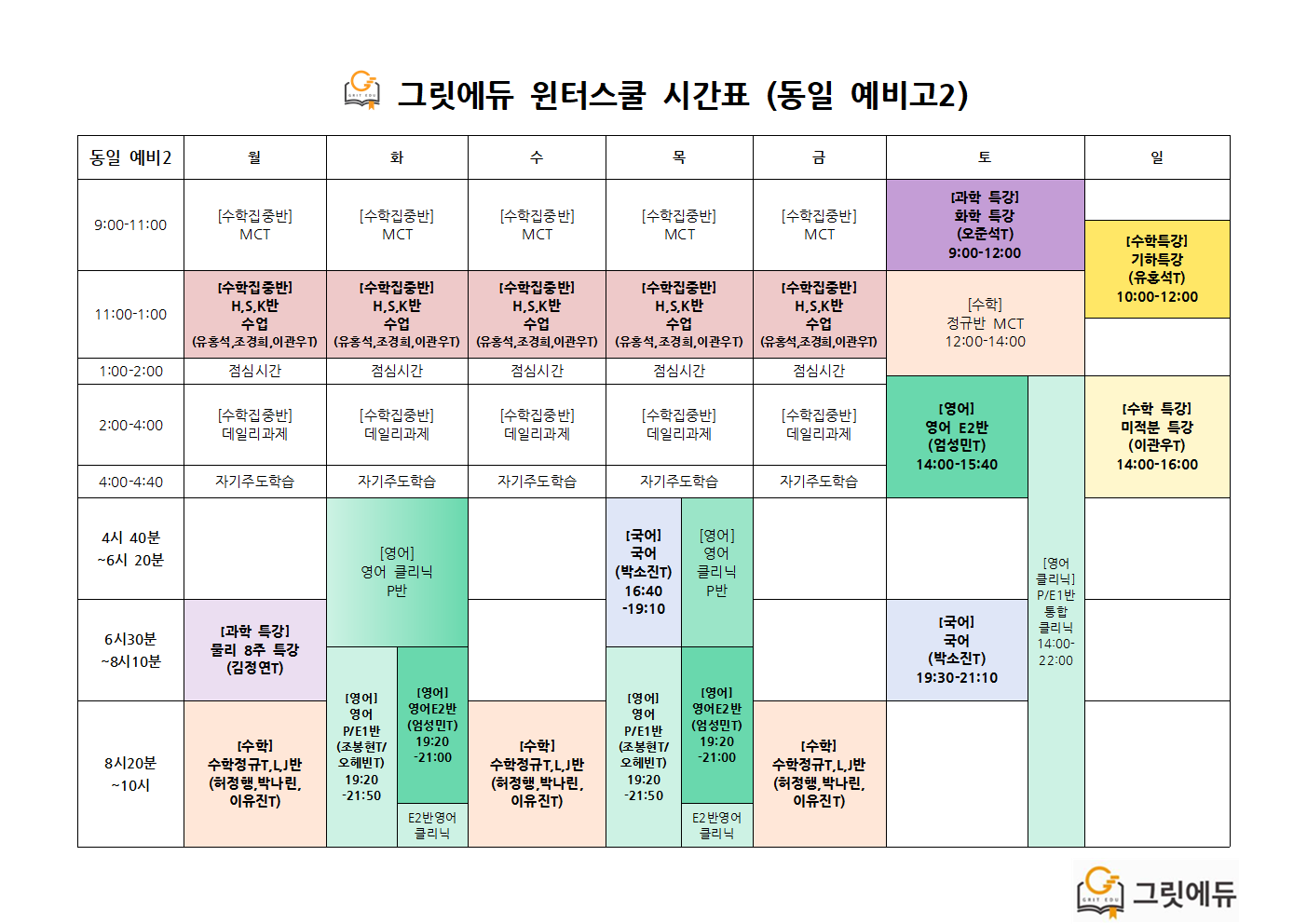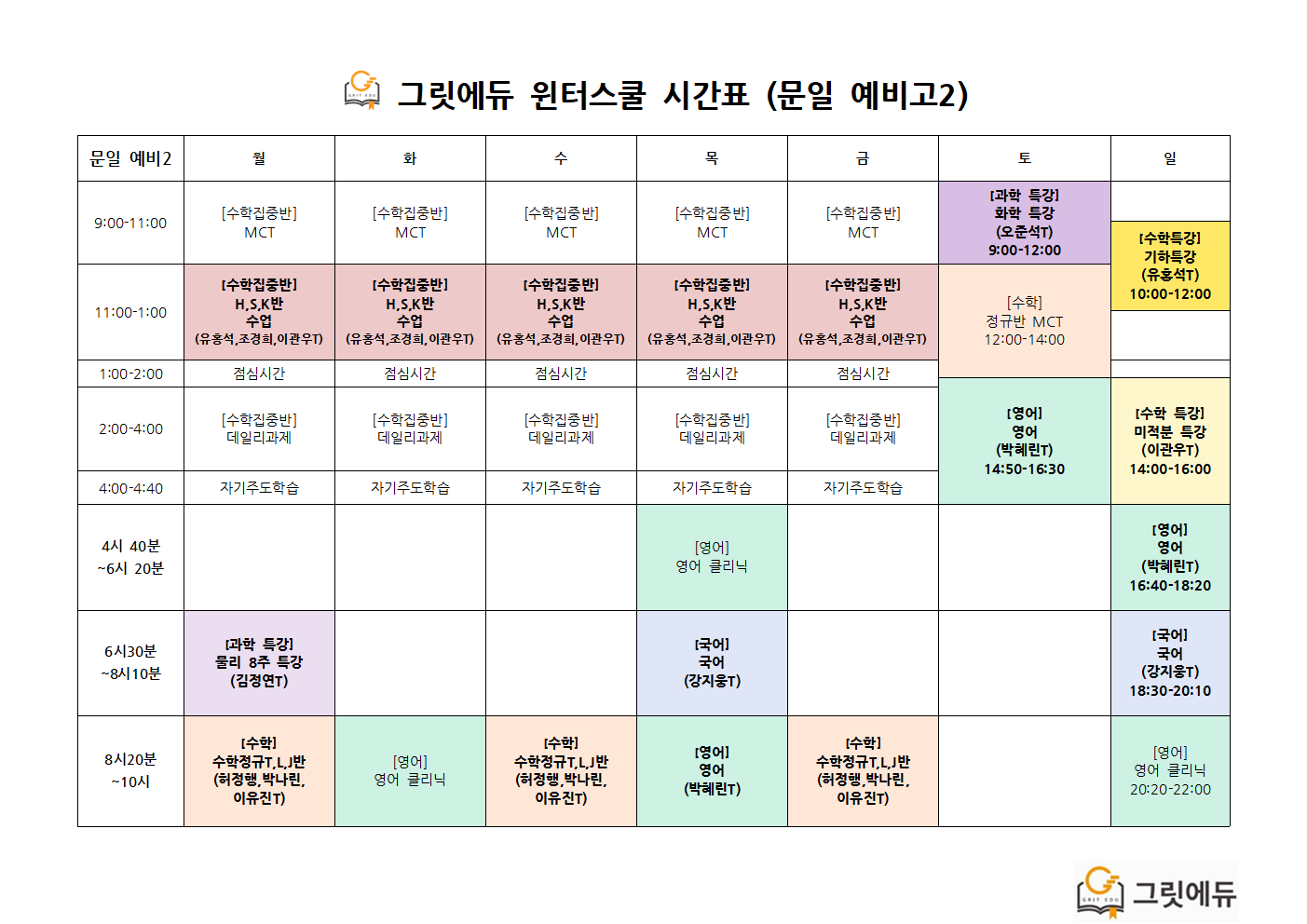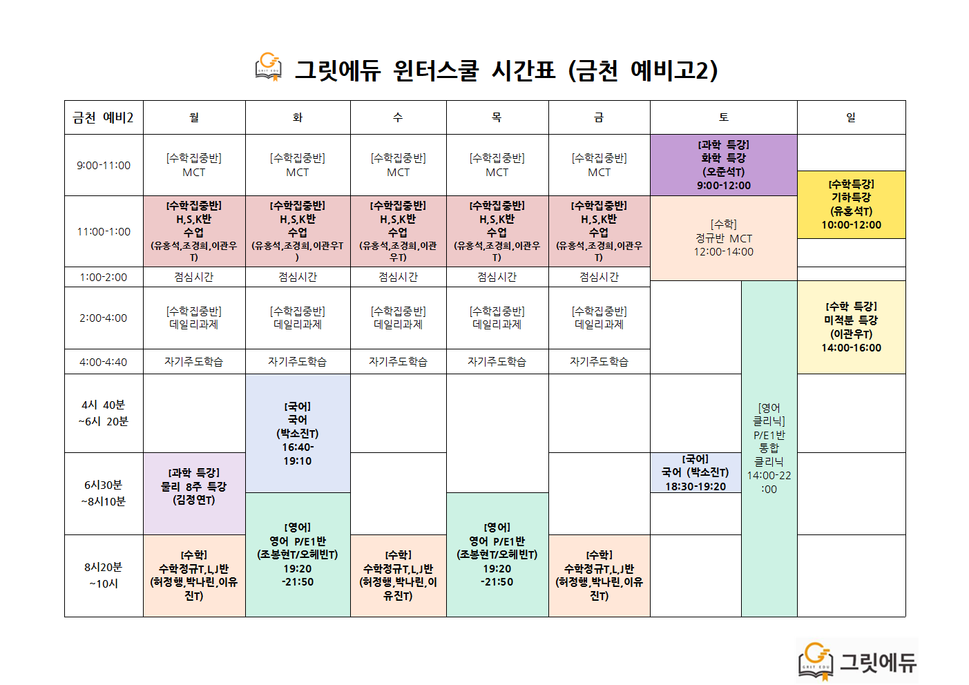 윈터스쿨 기간 수업 시간표입니다.